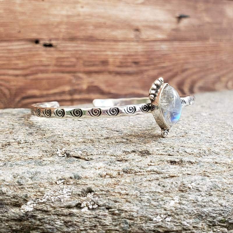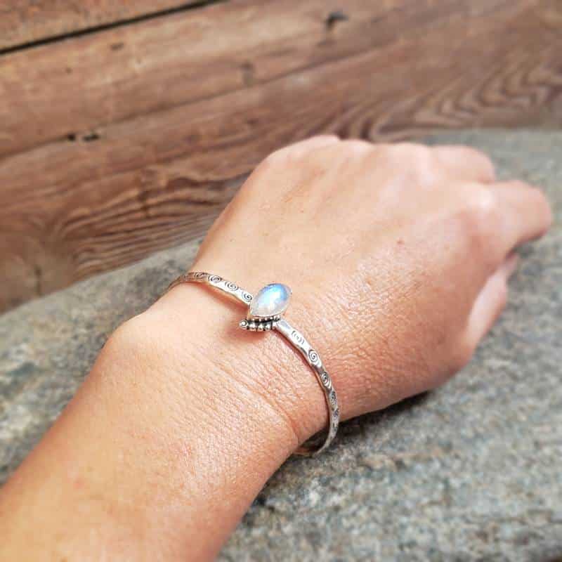 Le jonc pierre de lune argent est une superbe pièce unique au style ethnique chic. Un argent travaillé entoure la pierre de lune naturelle. Ces jolis reflets bleutés donne encore plus de charme à ce bracelet. Le jonc est composé d’une bande d’argent travaillé et finement gravée.