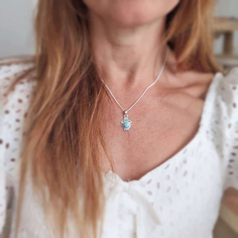 Le petit pendentif larimar argent AMOUR est une création artisanale, fait-main. Cette pierre naturelle ne se trouve que dans les Caraïbes est sa rareté en fait une pierre convoitée. Symbole de l’amour, l’histoire raconte qu’elle retient l’être aimé.